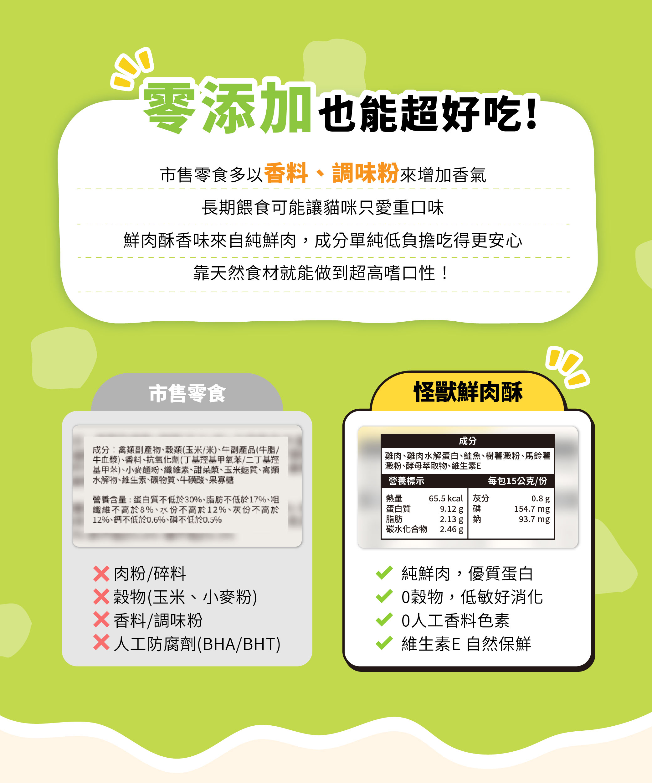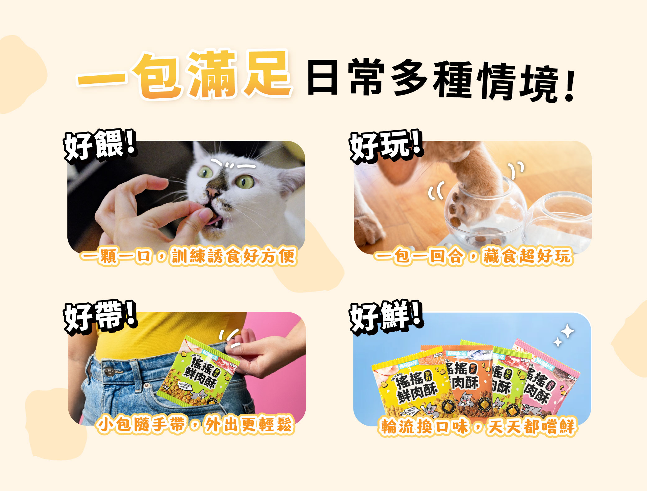 ※ 一串4包,口味分別為:雞肉鮭魚、鰹魚、雞肉牛肉、墨魚(無單包販售) ※ 鮮肉酥由天然原料慢烘製成,每顆尺寸、外觀及顏色可能略顯不同,皆屬正常現象,請小怪獸安心食用!