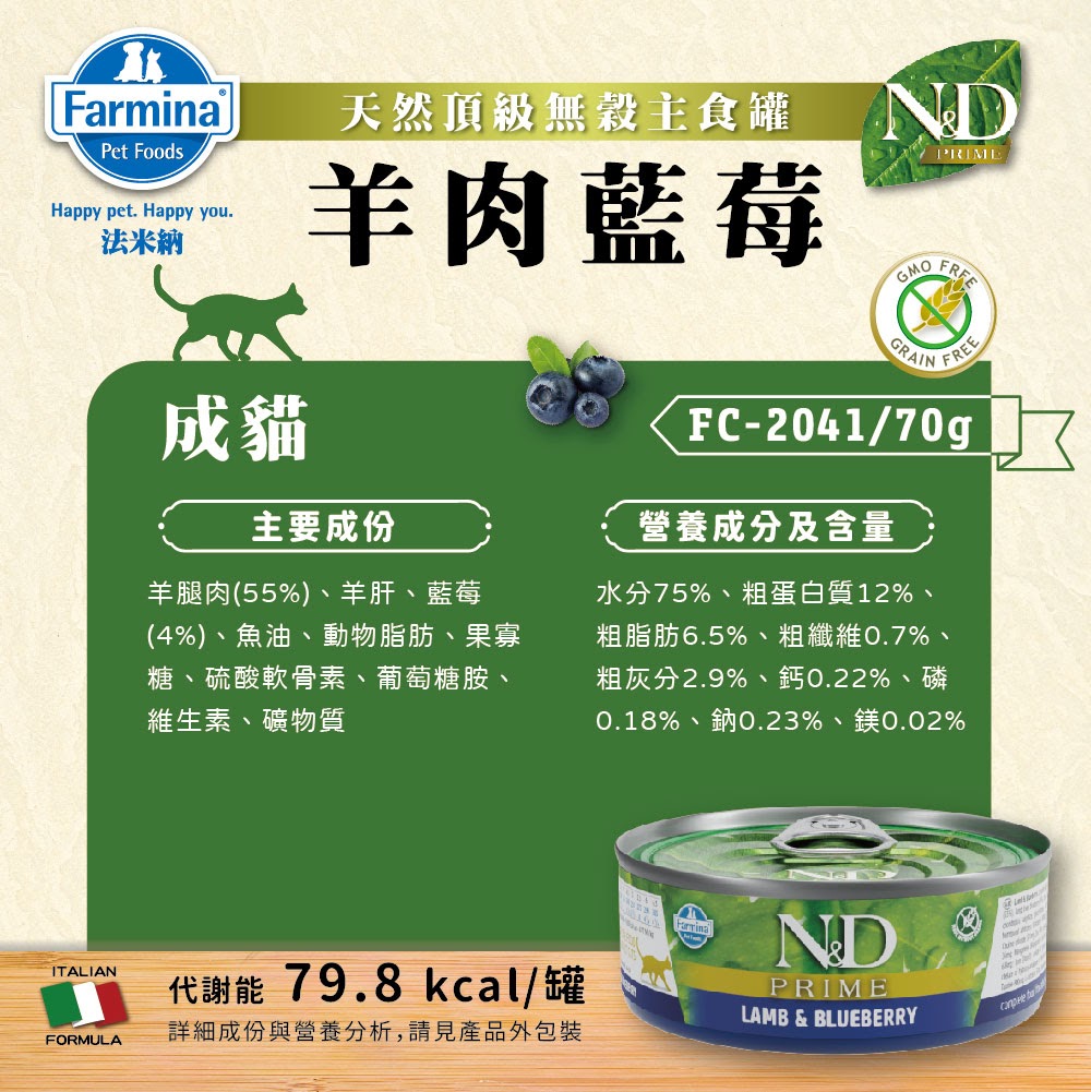Farmina 成貓 羊肉藍莓 天然頂級無穀貓用主食罐 70g
